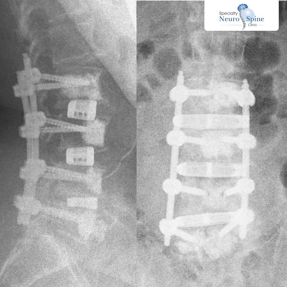 One of the most intricate and composite procedures, Zainab’s post-operative imaging at the time (above) shows clear vertebral alignment and stability achieved through minimal intervention.