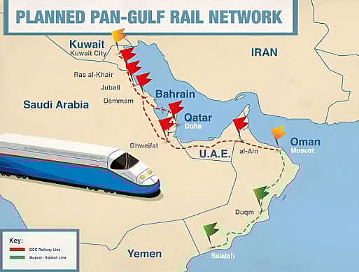 Rail routes connecting Saudi Arabia, UAE, Oman, Qatar, Kuwait and Bahrain